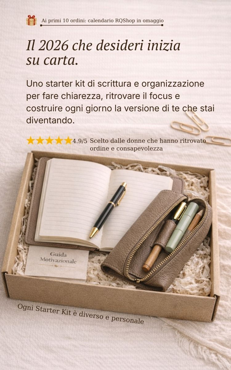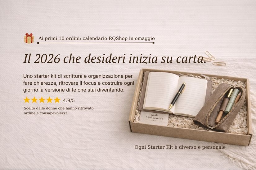 Lo STARTER KIT nasce proprio per questo: accompagnare, in modo gentile e accessibile, verso una routine di scrittura consapevole. Un rituale fatto di carta, tempo e attenzione, per rallentare, fare ordine e ripartire da sé.