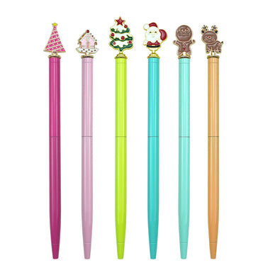 Le penne natalizie in metallo sono eleganti e festive, perfette da regalare o da tenere sulla scrivania durante le feste. Hanno punta a sfera con inchiostro blu e sono ricaricabili, per essere utilizzate a lungo. Ogni penna presenta una punta decorata con soggetti natalizi diversi (albero, renna, marzapane, Babbo Natale e altri).