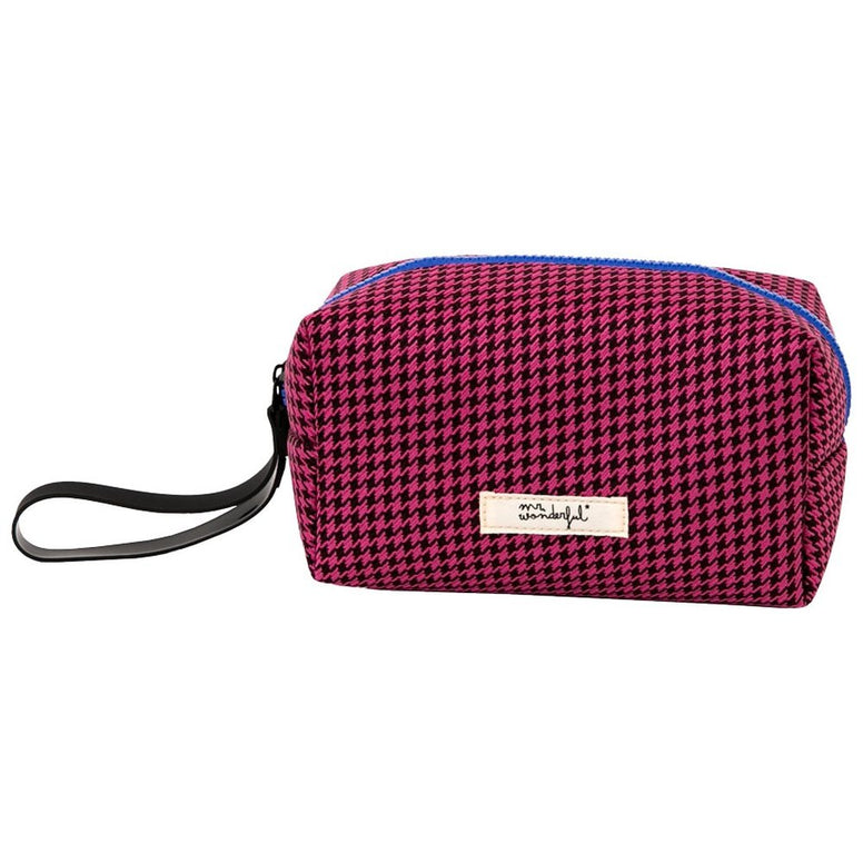 Una pochette in poliestere con chiusura a zip e pratico tiretto da polso, ideale per avere tutto a portata di mano. La fantasia pied de poule e i colori vivaci la rendono un accessorio originale e pieno di carattere.